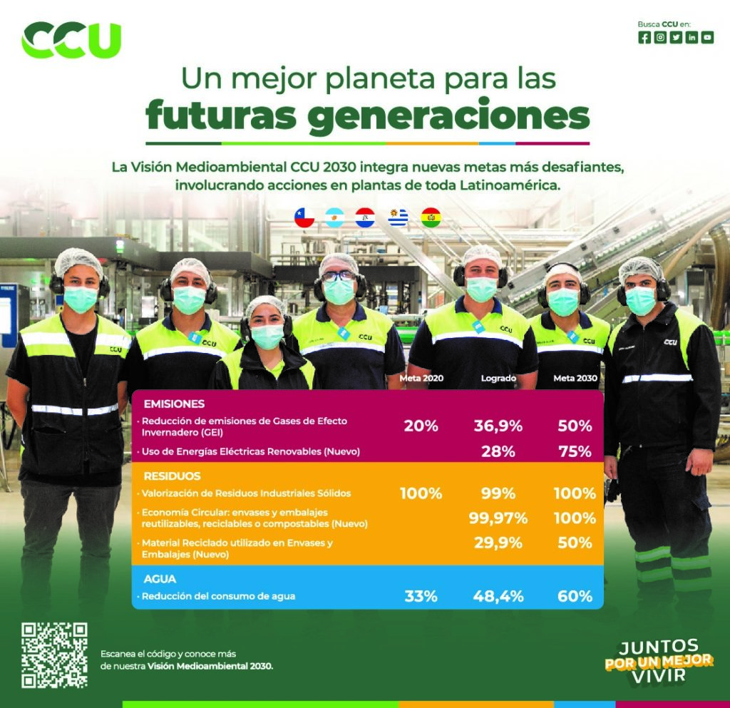 Hace más de doce años CCU se planteó realizar aportes concretos a la protección del medio ambiente, con su Visión Medioambiental 2010-2020 para sus operaciones en Chile y Argentina. Tras ese periodo, cumplió con las metas propuestas: redujo en 35,7% las emisiones de gases efecto invernadero por litro producido (la meta era 20%), disminuyó en 48,6% el uso de agua por litro producido (la meta era 33%) y en valorización de residuos industriales sólidos, alcanzó 99,4% (la meta era 100%).